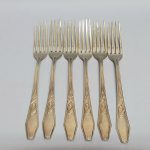 Zestaw sztućców z początku XX wieku – 6 widelców. Warszawska fabryka – Norblin. Srebrzenie na mosiądzu – większość sztućców wymaga srebrzenia. Długość 20,5cm.