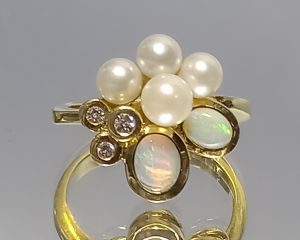 Pierścionek, złoto 14K opale, diamenty, perły morskie