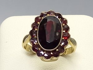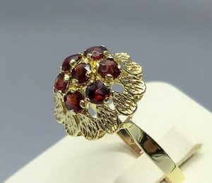 Stary pierścionek z granatami, złoto 8K