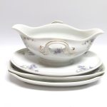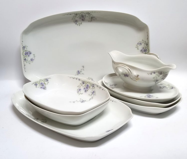 Śliczna porcelana środka stołu – zestaw sześciu półmisków i sosjerka.