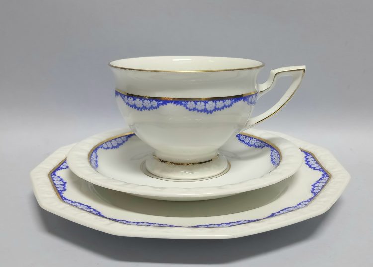 kalkomanii oraz złoty paseczek. Krawędź filiżanki i uszko podkreślone złoceniem.
