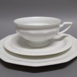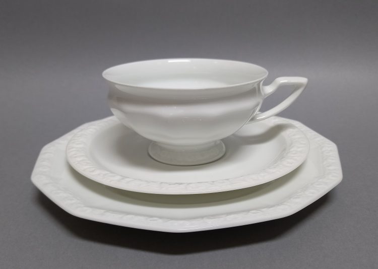 Biała porcelana dekorowana na brzegach charakterystycznym reliefem.