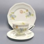 filiżanka do białej kawy w towarzystwie spodka i talerzyka deserowego.