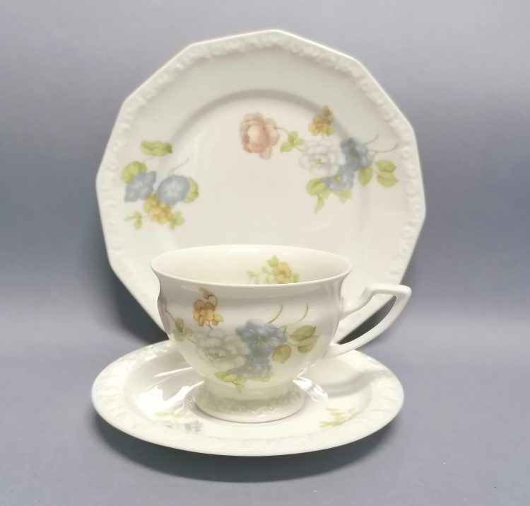 Śnieżnobiała porcelana dekorowana na brzegach charakterystycznym reliefem.