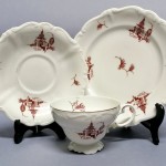 herbaciana filiżanka w towarzystwie spodka i talerzyka deserowego.
