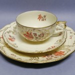 wypukłymi, złoconymi reliefami oraz kwietną kalkomanią w jesiennej tonacji.
