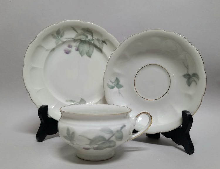 Subtelne zdobienie motywem liści i owoców jeżyny, wykonano techniką kalkomanii.