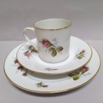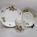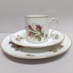 Śnieżnobiała porcelana dekorowana złoceniami i barwnym,