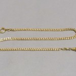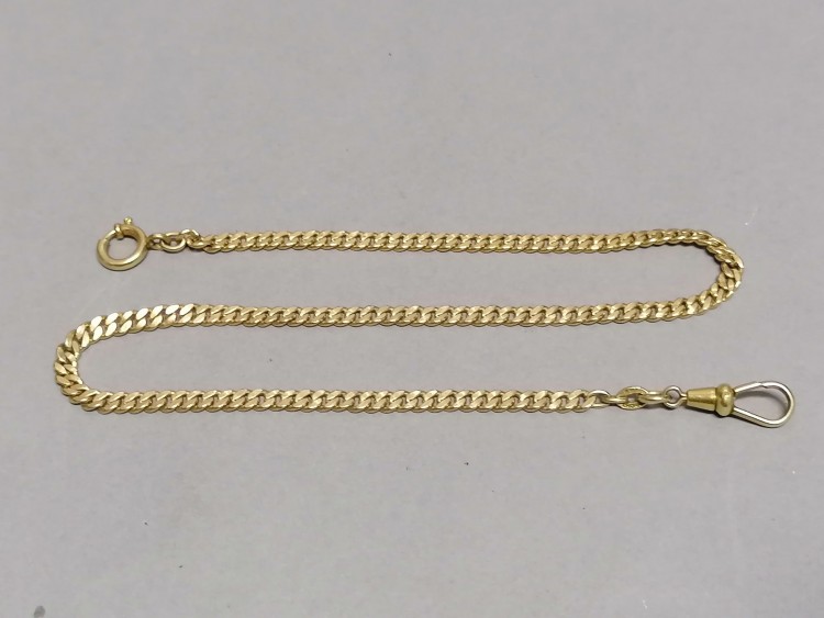Przedwojenna dewizka do zegarka kieszonkowego. Metal złocony – 20 mikronów złocenia. Punce: IMPORT/ 20 um Złocenie w dobrym stanie. Długość 36,5cm.