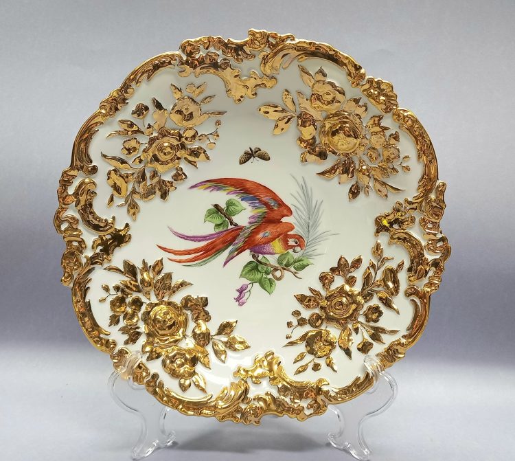 Złocona patera z papugą, Miśnia Meissen
